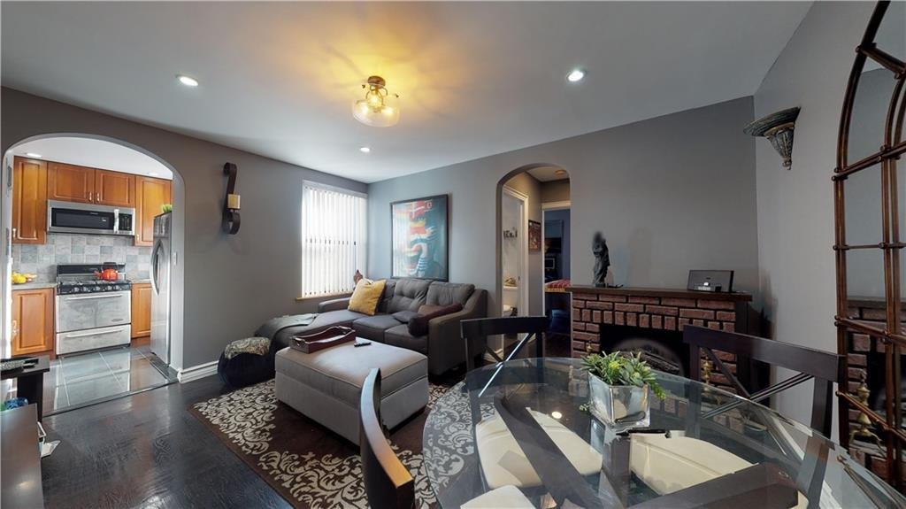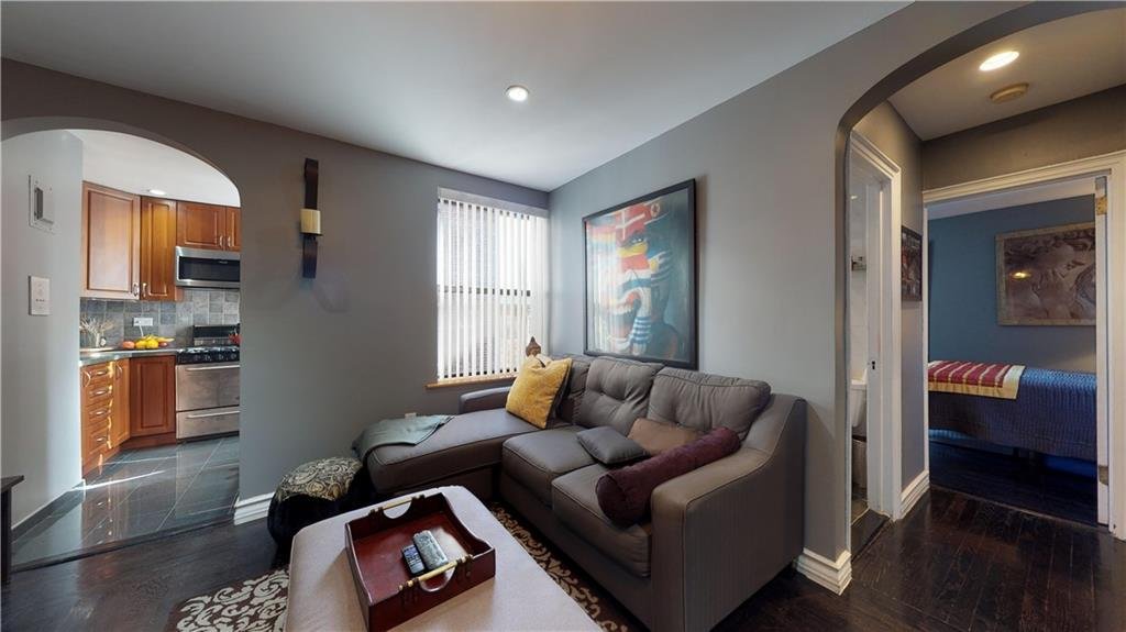 Upon walking into the apartment, you are welcomed with a charming living room drowned in sunlight, beautifully stained hardwood floors, high-hat lighting, and an open archway to the kitchen. The kitchen features beautiful tile work, recently updated cabinets, and is decked out with stainless steel appliances. The bedroom is large, can accommodate a king-sized bed, and is accessed through the corridor where you will also find a large double-sized closet and a recently revamped full bathroom.
